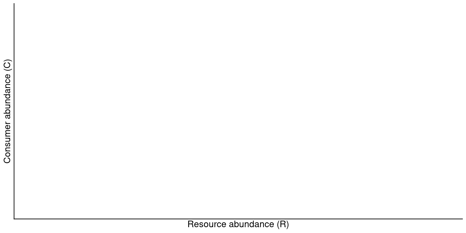 Consider the dynamics of a “consumer” species \(C\) and a “resource” species \(R\)